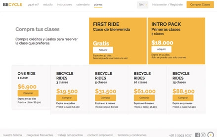 Interesante proyecto hecho a la medida en donde los usuarios compran créditos para usar en clases de ciclismo indoor. Los usuarios seleccionan el día al que asistirán y la ubicación de su bicicleta.